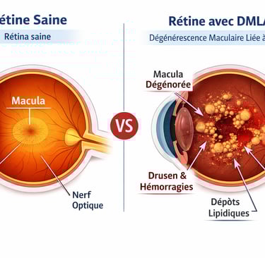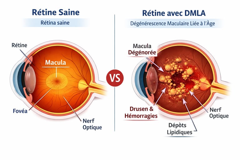 La dégénérescence maculaire liée à l’âge (DMLA) est une maladie chronique de la rétine qui touche la macula, zone centrale responsable de la vision fine et détaillée.